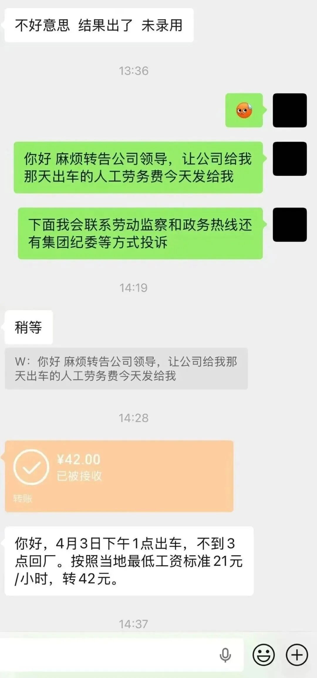 未录用后,公司拒不付报酬,反复索要仅给42元,按2小时超低标准结算,等候、服务时长一概不算,远低于市场行情,纯属恶意克扣!