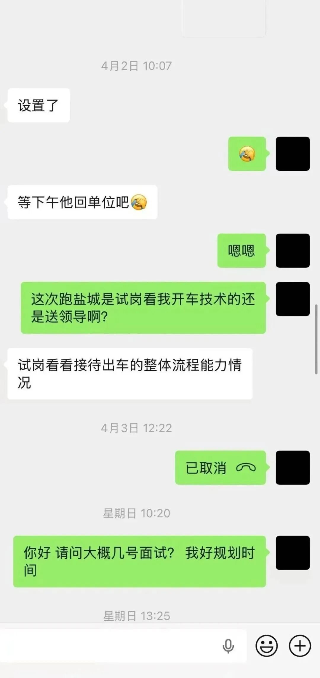 4月再次承诺单独复试,结果不面试先派活,让求职者开车往返盐城-射一求职阳接送领导,提前到岗全程服务。
